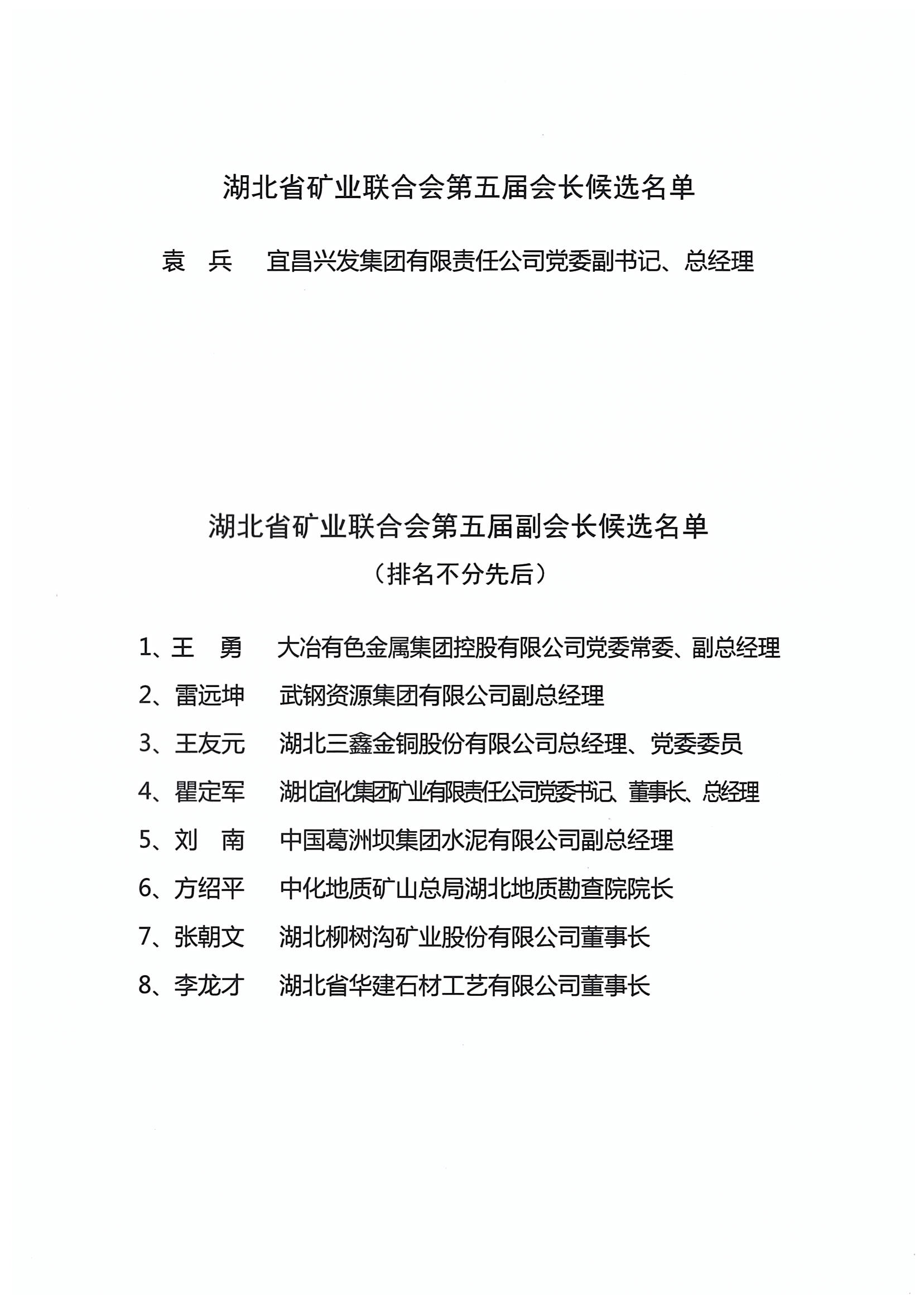 湖北省礦業聯合會第五屆會長、副會長候選名單公示