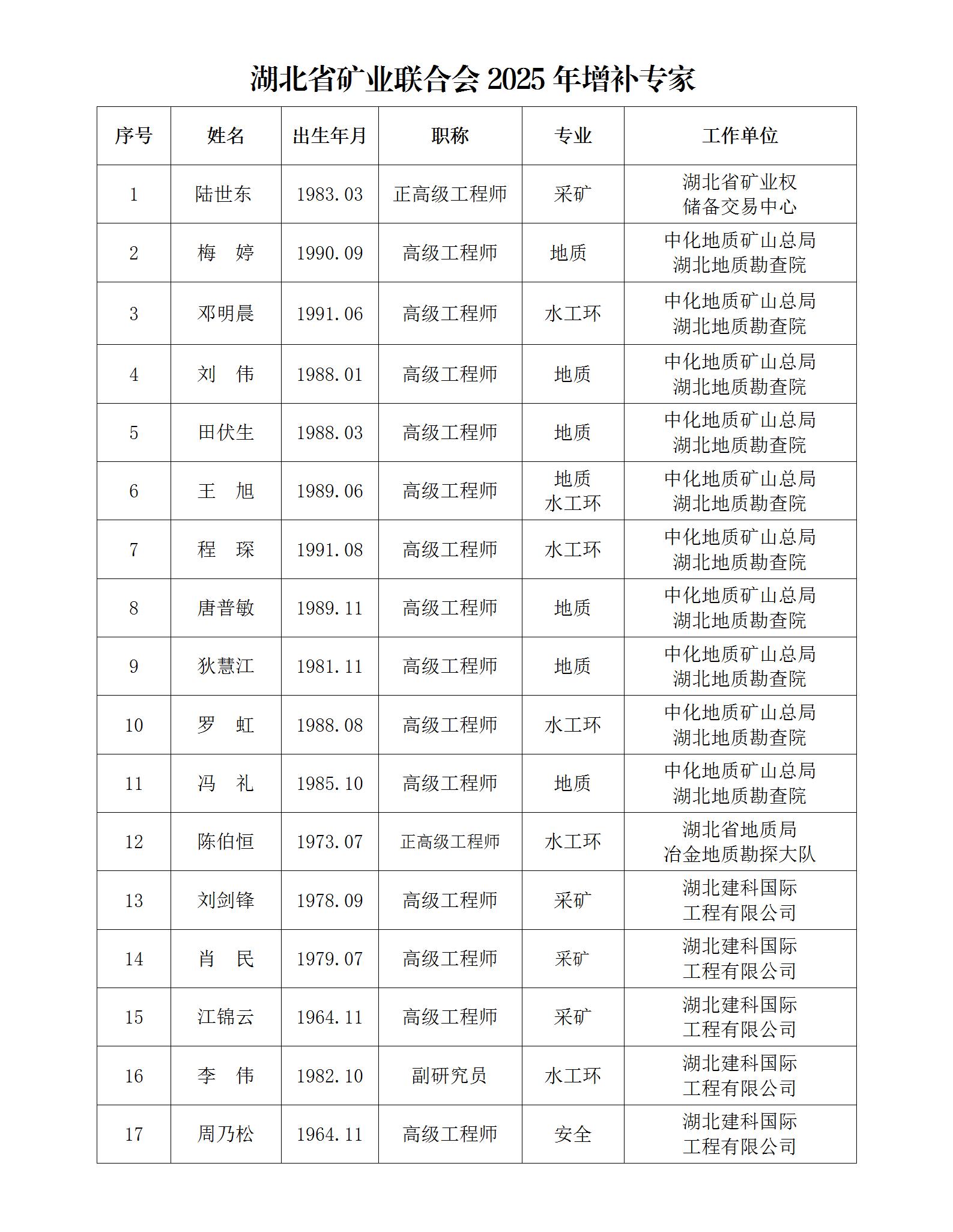 湖北省礦業聯合會2025年增補專家公示(第二批)